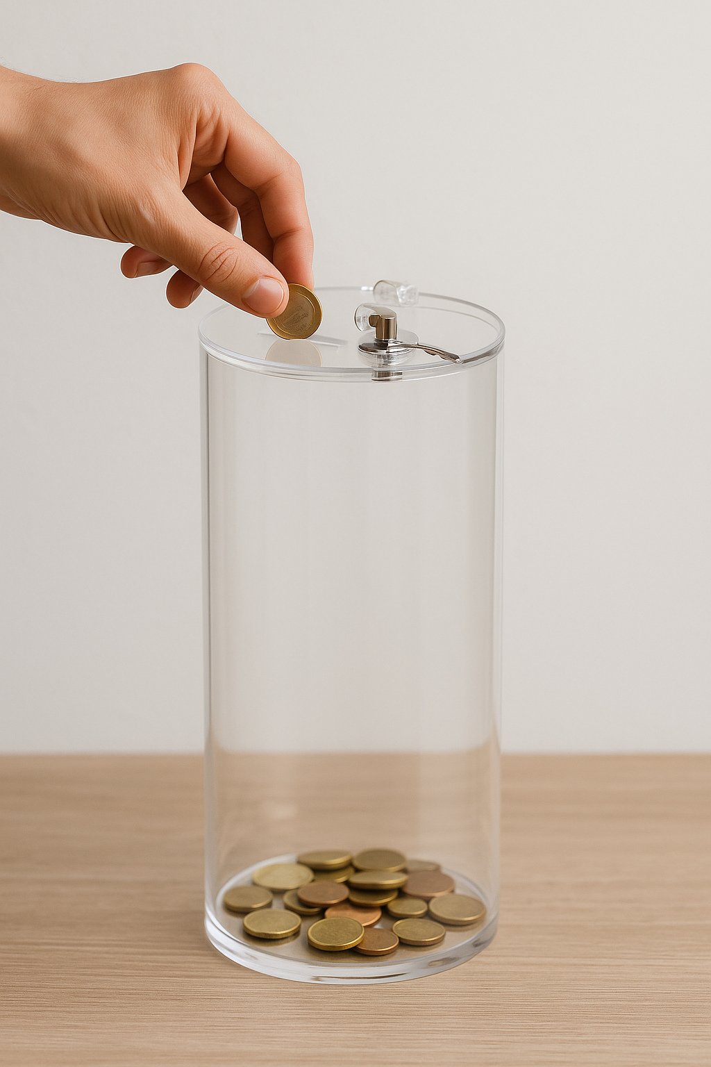 Цилиндричните дарителски кутии в касовата зона са дискретен, но изключително ефективен начин да се подкрепят каузи.