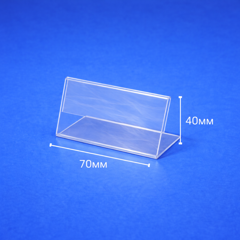 Прозрачна стойка за ценови и информационни етикети с размер 70 × 40 мм, изработена от тънък пластичен материал.