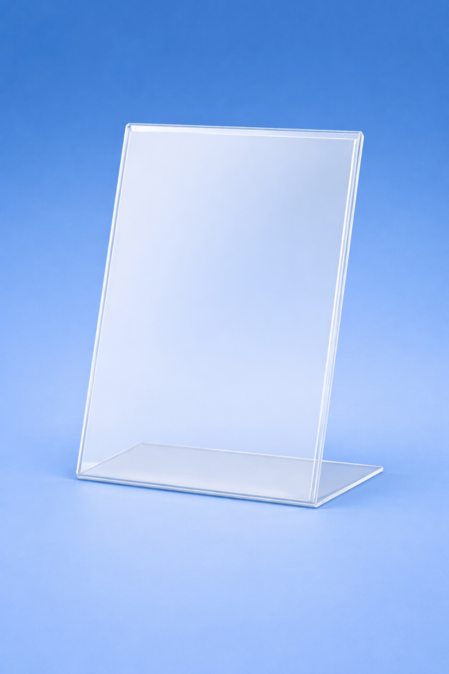 Стойката е изработена от прозрачен PET материал, който осигурява ненатрапчив външен вид и позволява фокусът да остане върху съдържанието. Еднолицевата конструкция с лек наклон подобрява видимостта на поставения лист и улеснява възприемането му.
