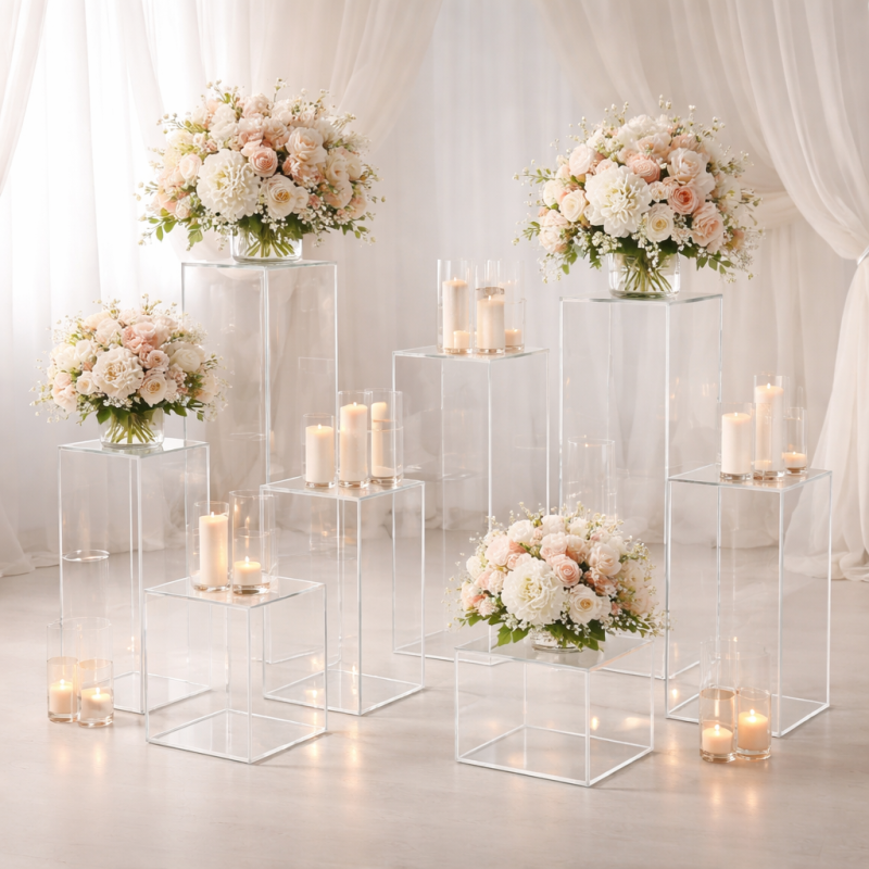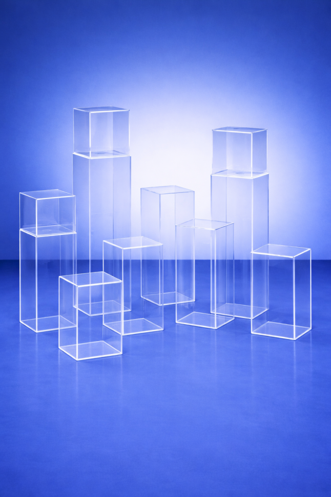 Прозрачни плексигласови масички и подиуми - професионално решение за събития, търговски обекти и витрини.