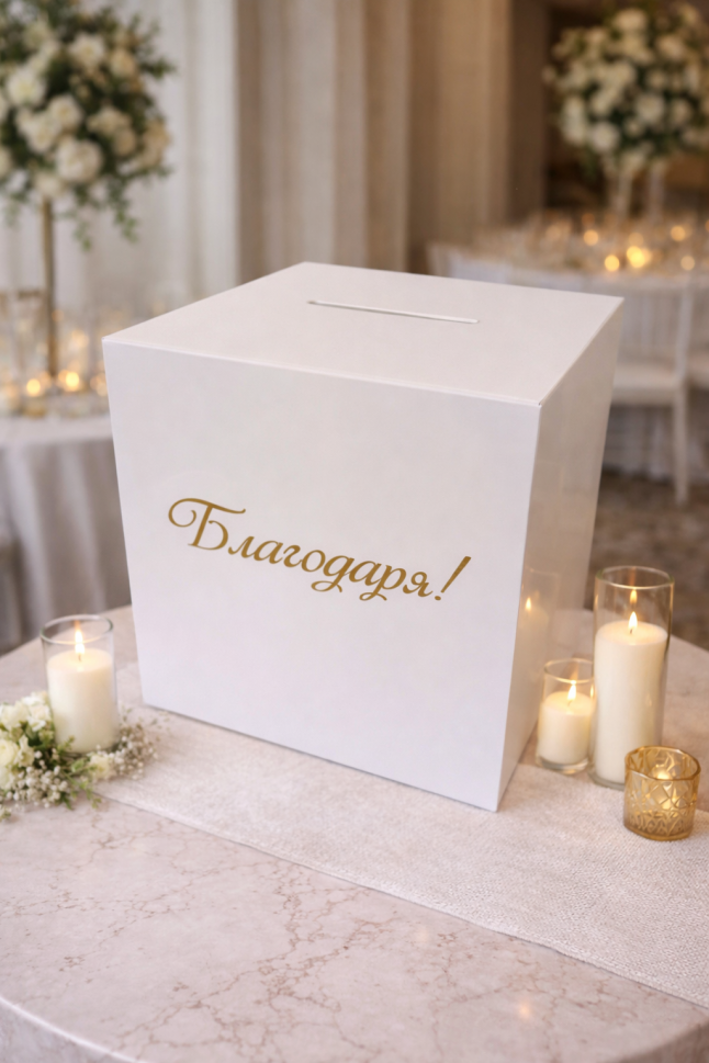 Кутия от бял, черен или прозрачен плексиглас с надпис „Благодаря“, предназначена за събиране на дарения и средства за кауза вместо букет.