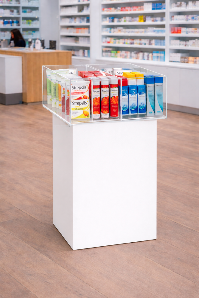 Промоционалният плексигласов стелаж с 4 отделения и бяла основа е проектиран за професионално представяне на продукти в аптеки, дрогерии и търговски обекти. Конструкцията съчетава стабилна основа с прозрачна горна част, която осигурява отлична видимост на изложените артикули.