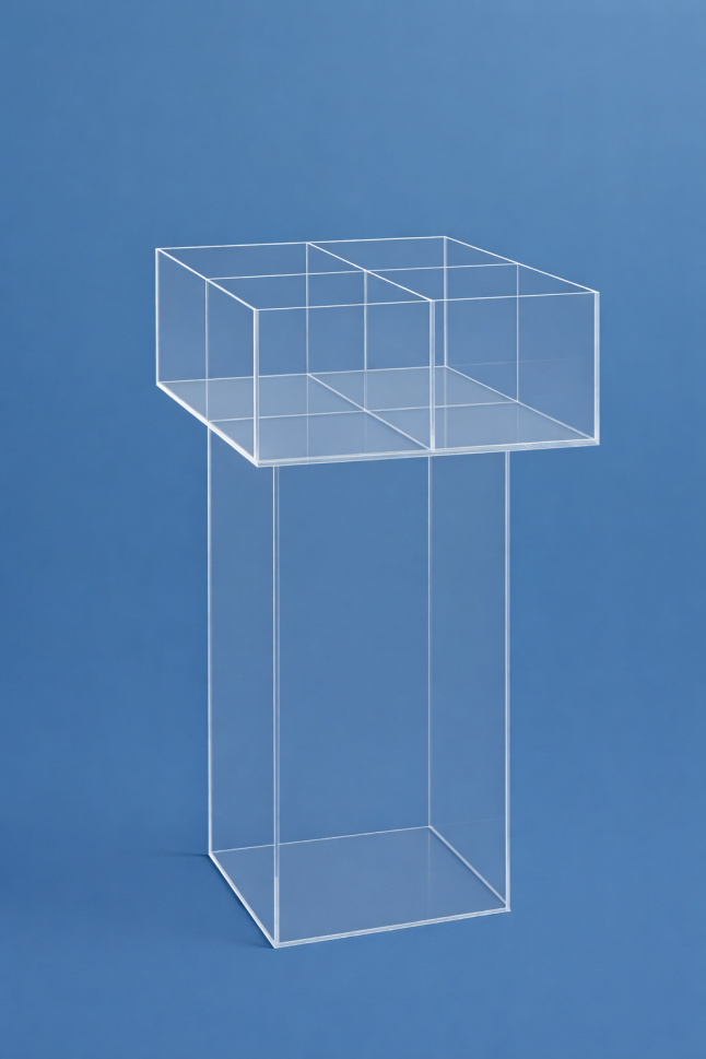 Промоционалният плексигласов стелаж дисплей с 4 отделения и прозрачна основа е предназначен за ефективно представяне на продукти в аптеки, дрогерии и търговски обекти с модерен интериор. Изцяло прозрачната конструкция осигурява максимална видимост на изложените артикули, без да натоварва пространството.
